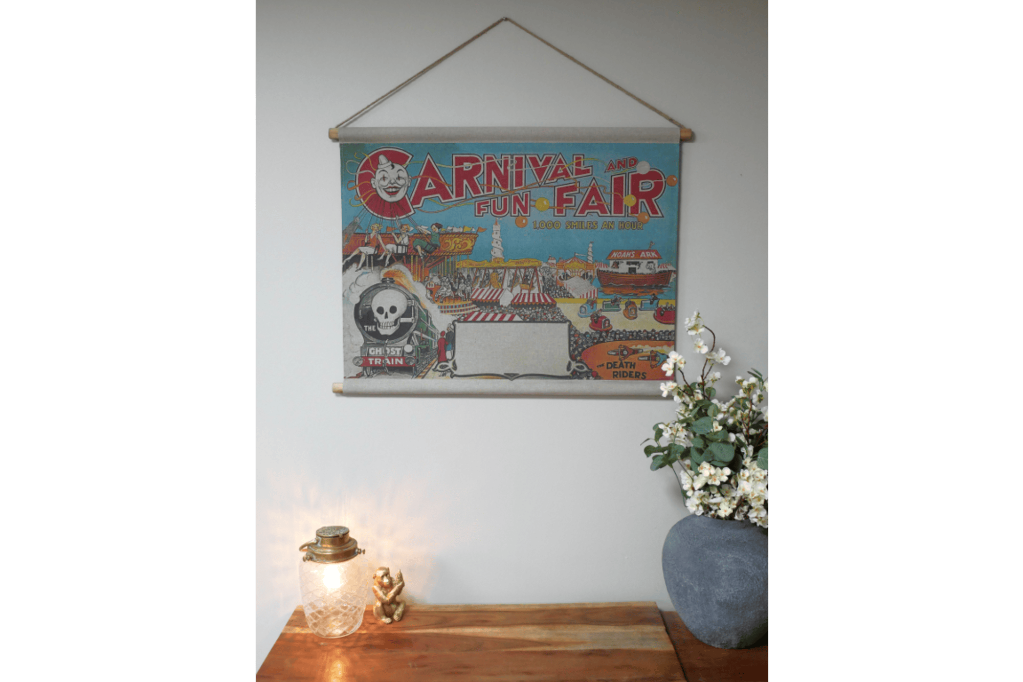 This funfair poster promises 1,000 smiles an hour (no refunds if you hit 999), these pieces turn any blank wall into a story.
