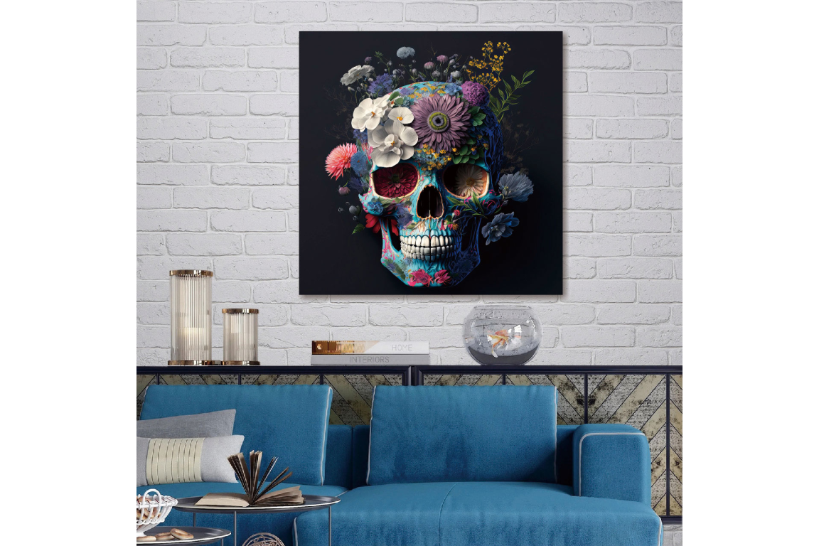 Bring a bold statement to your space with this Skull with Flowers glass art. Crafted from tempered glass, its 100cm square surface dazzles with striking gothic flair while offering durability and easy cleaning. At 10kg, it's a solid piece that instantly adds edge and personality to any wall. Perfect for anyone who loves a playful twist on dark décor.